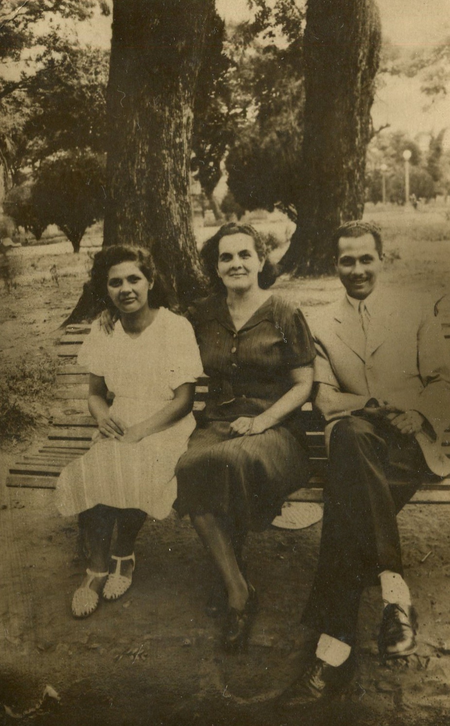 Hombre y mujeres en banco de plaza
